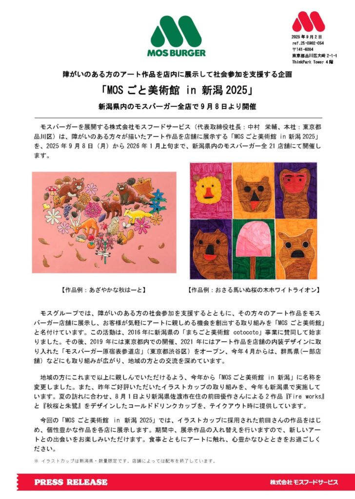 モスバーガーを展開する株式会社モスフードサービス(代表取締役社長:中村 栄輔、本社:東京都品川区)は、障がいのある方々が描いたアート作品を店舗に展示する「MOSごと美術館 in 新潟2025」を、2025 年9 月8日(月)から2026年1月上旬まで、新潟県内のモスバーガー全21店舗にて開催します。